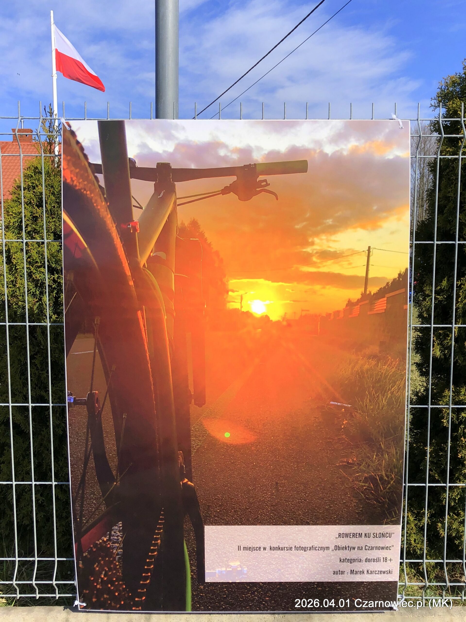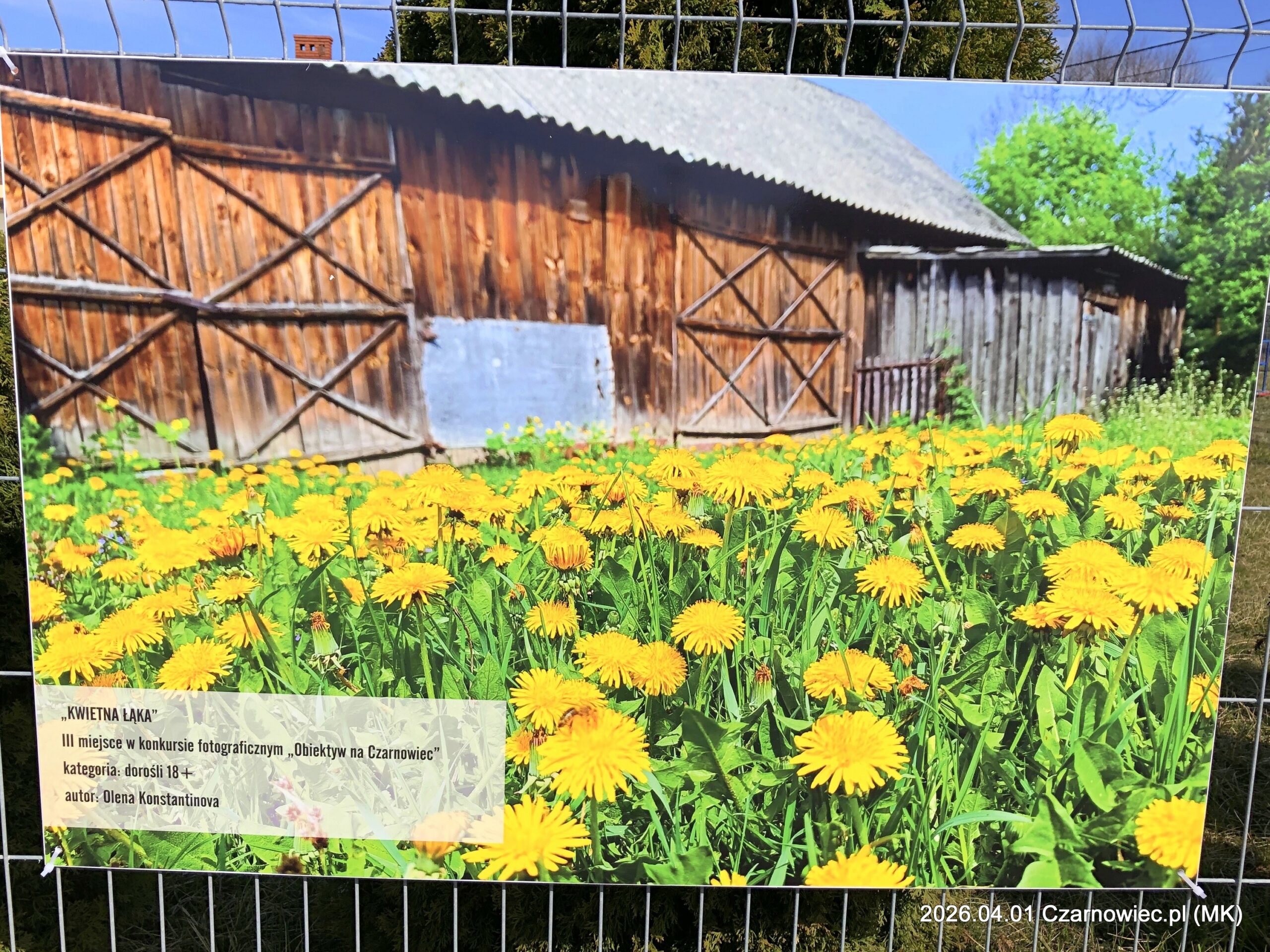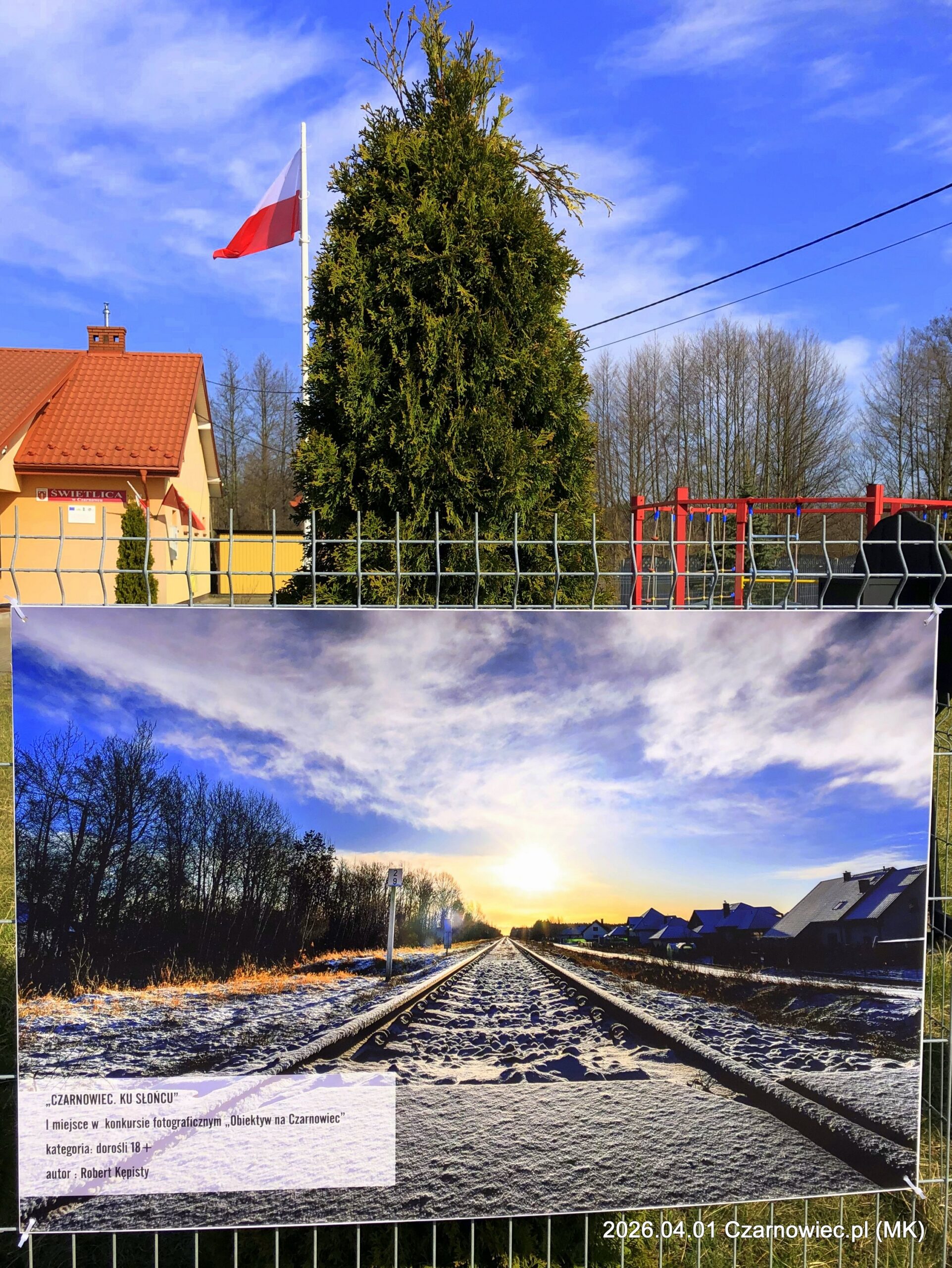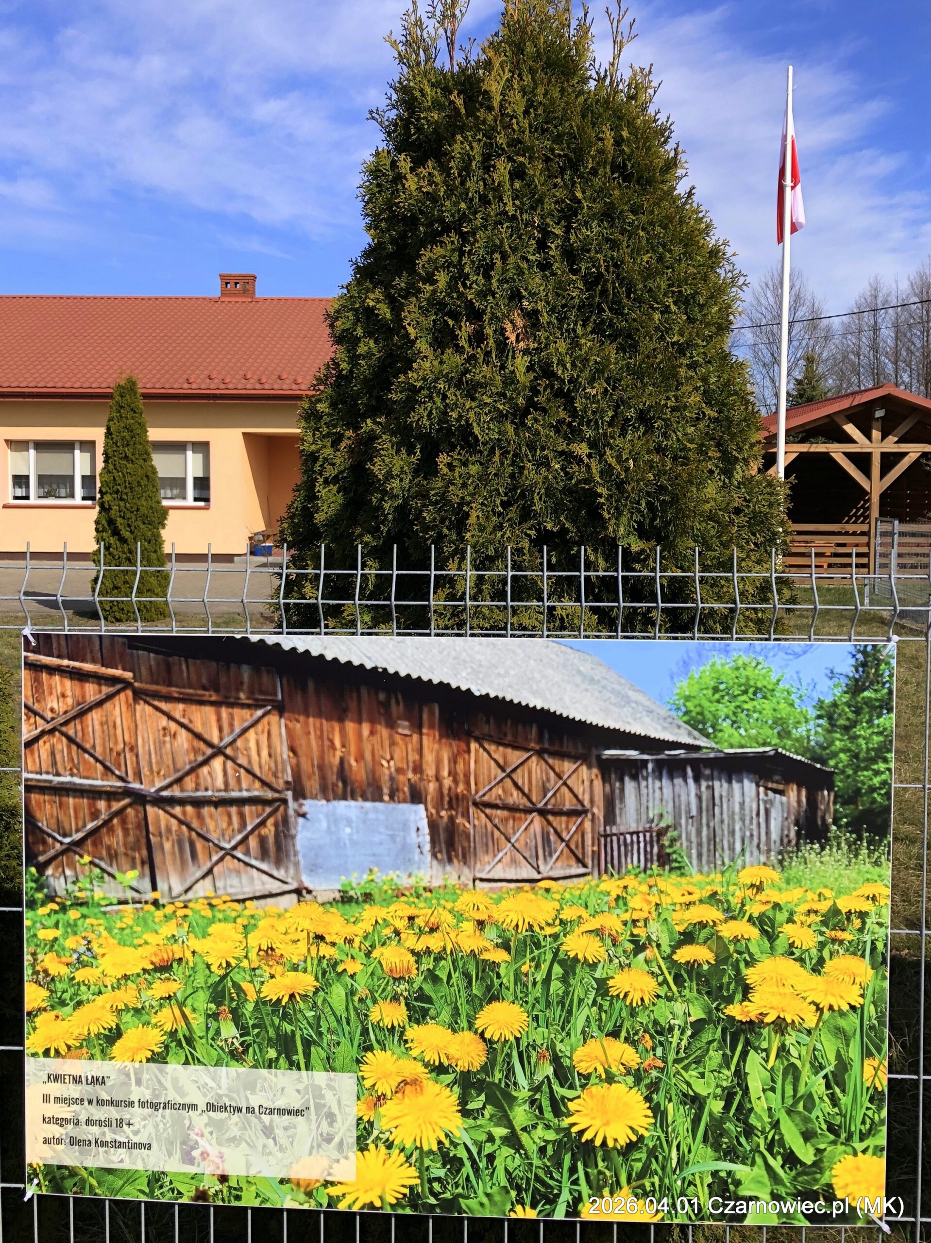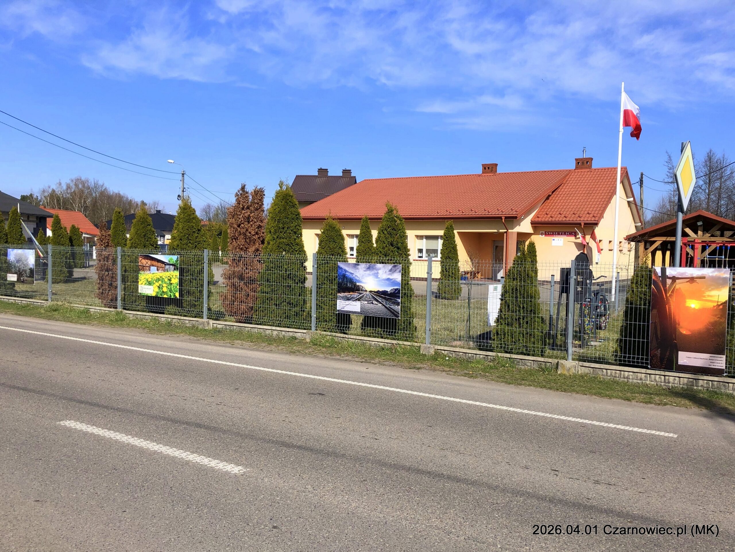 Pierwszego kwietnia 2026 roku (i to nie jako prima aprilis) Pani dyrektor Gminnej Biblioteki Publicznej w Rzekuniu – Organizatorka konkursu, wraz z pracownikiem Biblioteki zawiesili cztery zdjęcia wielkogabarytowe na ogrodzeniu Świetlicy Wiejskiej w Czarnowcu przy ul. Dzikiej Róży 2. Zdjęcia zawisły od strony drogi powiatowej 2550W.