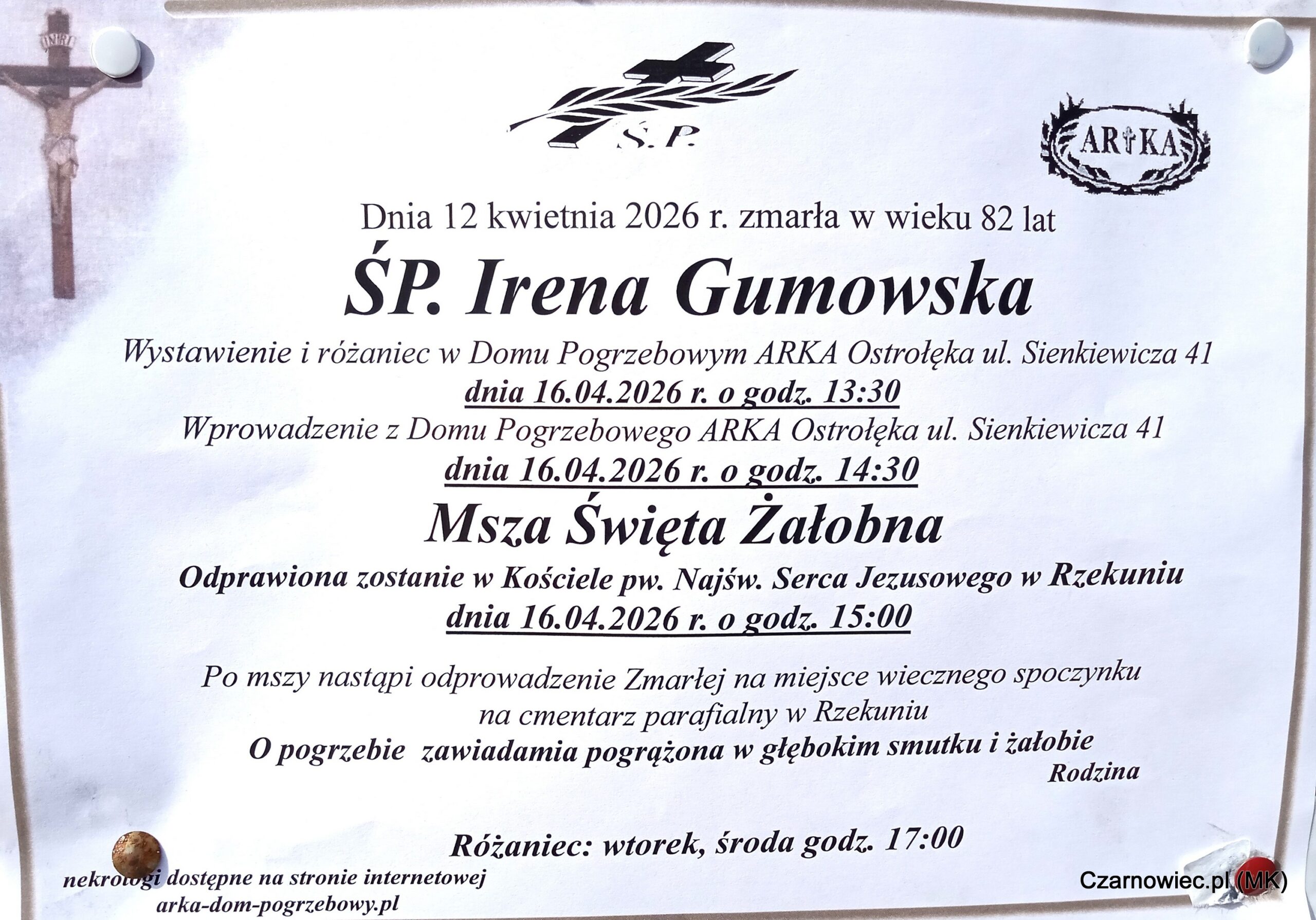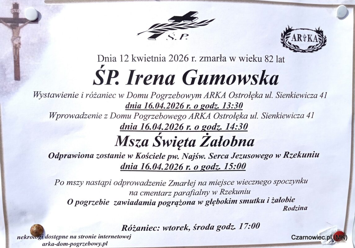 Irena Gumowska z Wołoszów, lat 82, nabożeństwo żałobne odprawione zostanie w czwartek 16 kwietnia 2026 r. o godz. 15.00 w kościele pw. Najświętszego Serca Jezusowego w Rzekuniu.