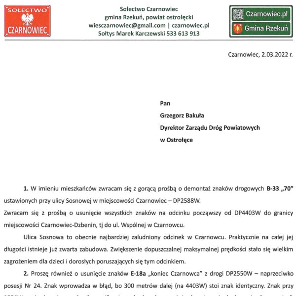 1. W imieniu mieszkańców zwracam się z gorącą prośbą o demontaż znaków drogowych B-33 „70” ustawionych przy ulicy Sosnowej w miejscowości Czarnowiec – DP2588W. Zwracam się z prośbą o usunięcie wszystkich znaków na odcinku począwszy od DP4403W do granicy miejscowości Czarnowiec-Dzbenin, tj do ul. Wspólnej w Czarnowcu. Ulica Sosnowa to obecnie najbardziej zaludniony odcinek w Czarnowcu. Praktycznie na całej jej długości istnieje już zwarta zabudowa. Zwiększenie dopuszczalnej maksymalnej prędkości stało się wielkim zagrożeniem dla dzieci i dorosłych poruszających się tym odcinkiem.