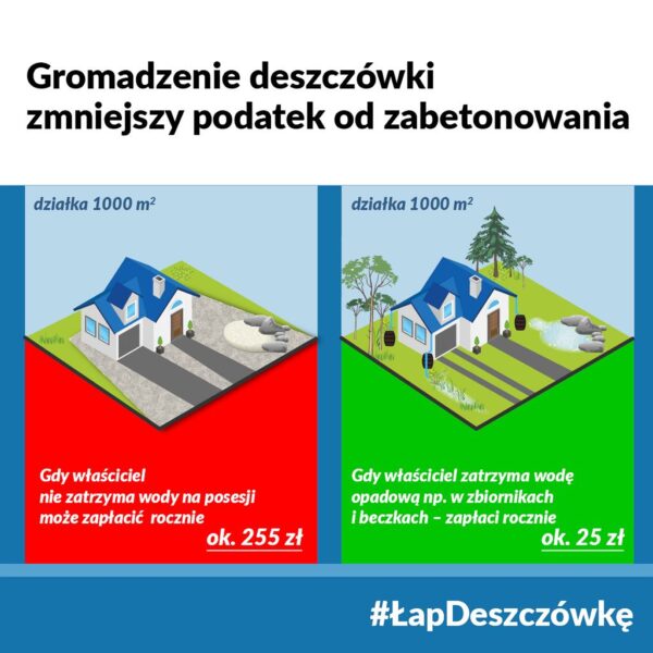 - 0,60 zł za 1 m² za każdy rok – gdy zastosowano urządzenia do retencjonowania wody o pojemności do 10% odpływu rocznego.