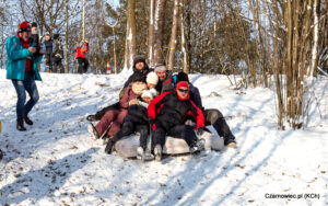 -15 stopni mrozu ale za to mocne promienie słońca i brak wiatru nie pozwalały na odczucie tak niskiej temperatury. Z niecierpliwością czekaliśmy na śnieg, szczególnie po ubiegłorocznym zjeździe, gdy musieliśmy zjeżdżać na kółkach. Zaśnieżony „stok” u Państwa Chełstowskich na Zaborzu cieszył się powodzeniem nawet w tak niekorzystnych warunkach pogodowych (niska temperatura). Wiele osób dorosłych i dzieci zdecydowało się zjeżdżać na „byleczym”. – narto-sanki; – maska samochodu; – koło do pływania; – materac do spania ze ślizgami pod spodem; to najbardziej popularne „bolidy” tego dnia.